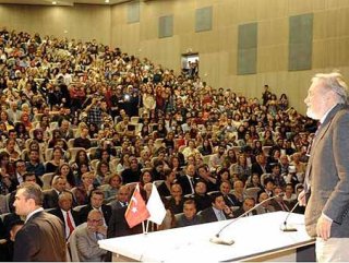 Saatler öncesinden bin 300 koltuk kapasiteli İçdaş Kongre ve Fuar Merkezi’ni dolduran öğrenciler yer kalmayınca, merdiven aralarına oturdu, bazıları ise ayakta izlemek zorunda kaldı. Salonun tıka basa dolduğunu görüp söyleşiyi dinlemeden gidenler de oldu.