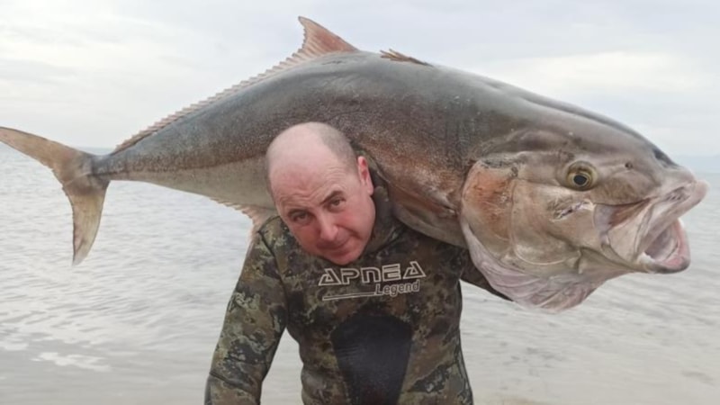 Doğan, zıpkınıyla 63 kilogram ağırlığında 1.8 metre boyunda akya balığı avladı.