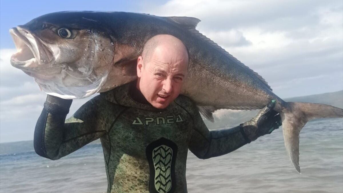 Çanakkale'de hobi amaçlı tüpsüz serbest dalış gerçekleştiren Çetin Ege Doğan, zıpkınla yakaladı balığı zorlukla çıkardı.