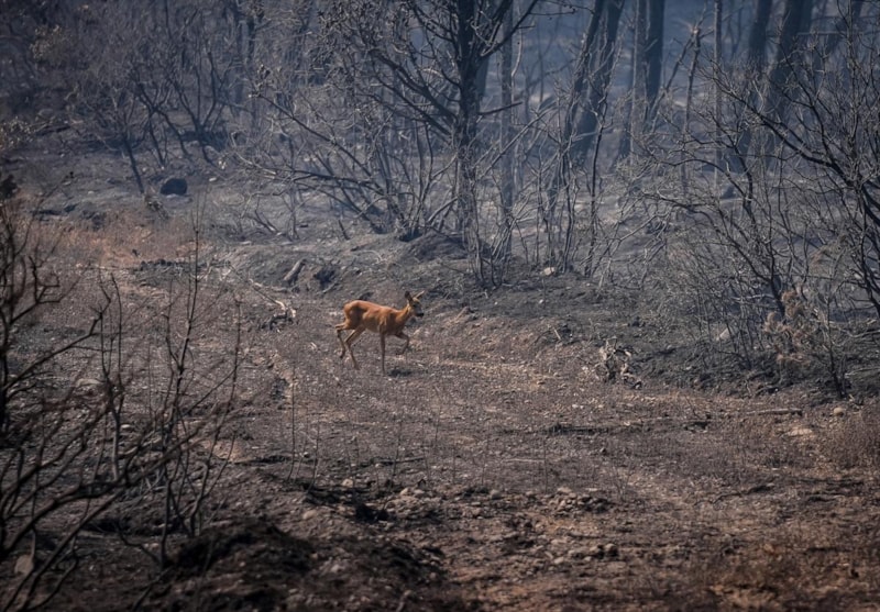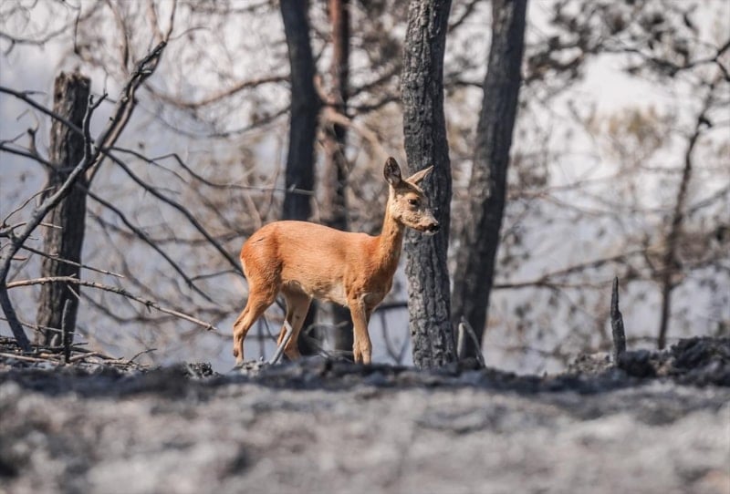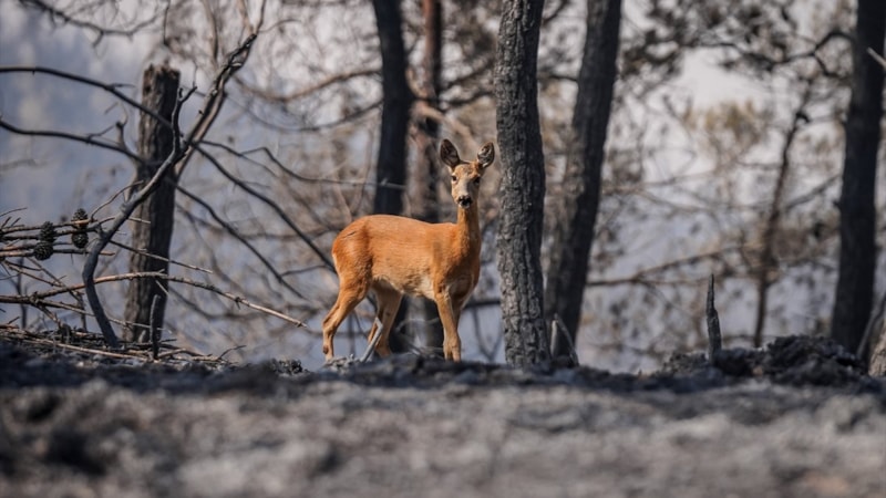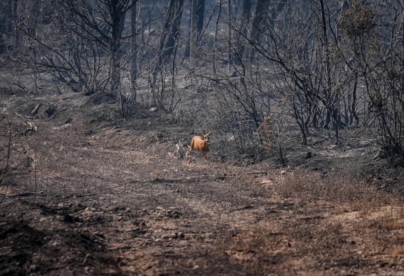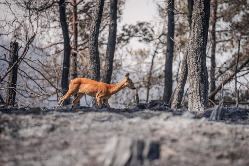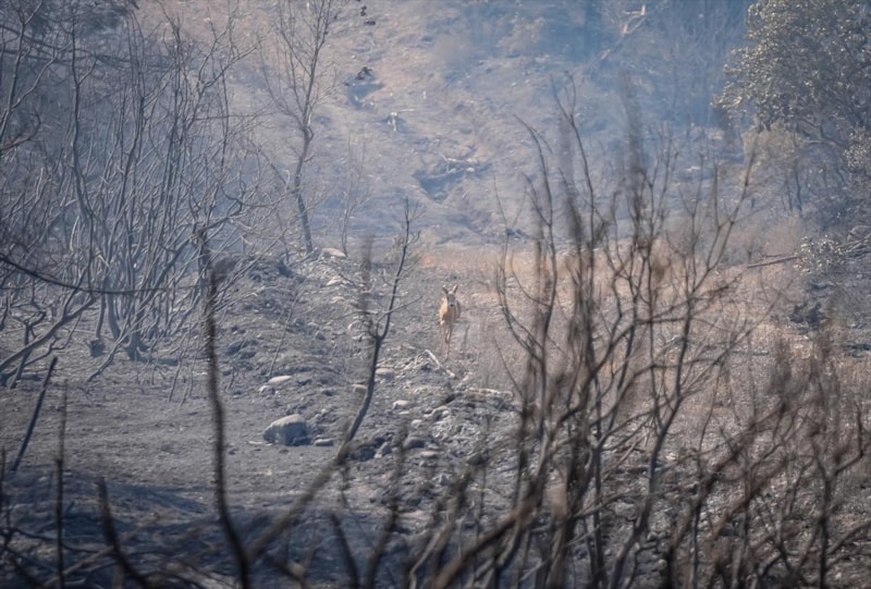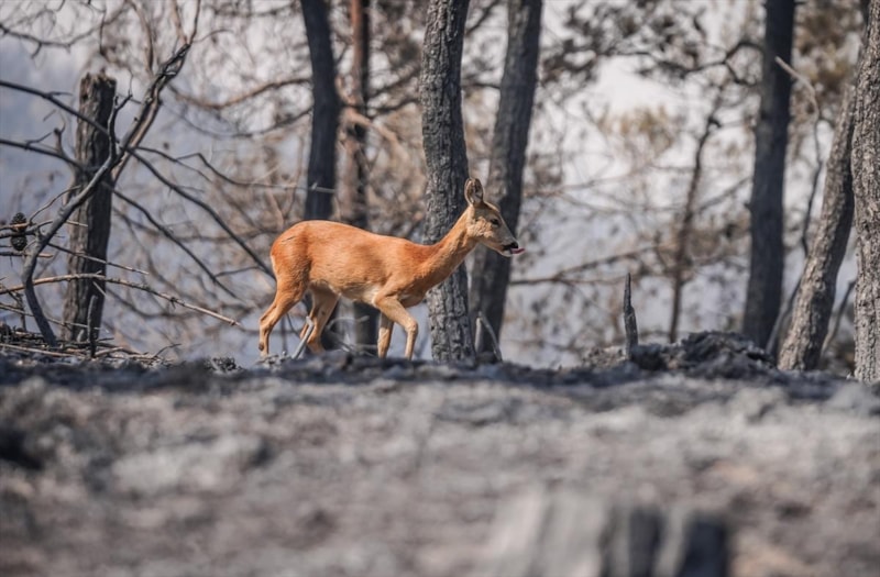 Çanakkale'nin Gelibolu ilçesinde ormanlık alanda başlayıp Eceabat ilçesine ulaşan yangında alevlerden kaçan karaca görüntülendi.