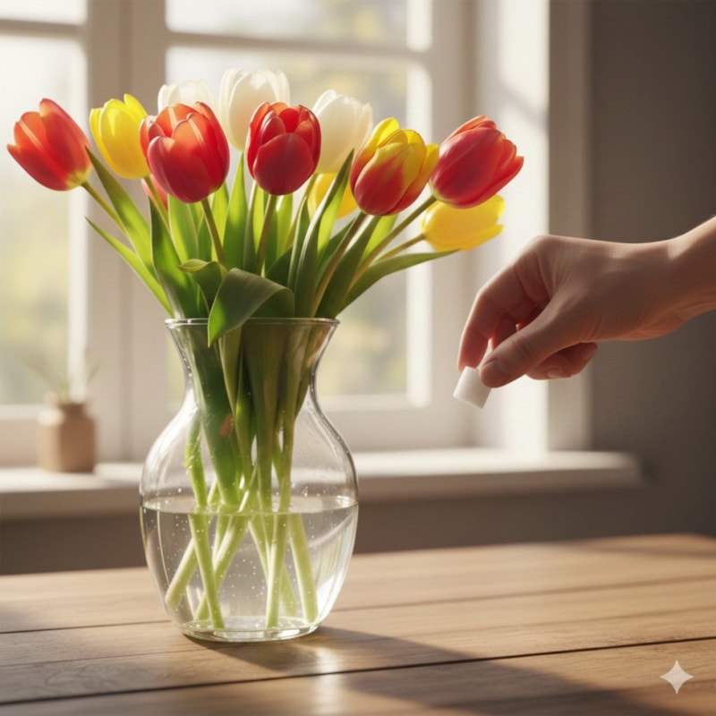 Bir miktar suyla şekeri karıştırıp vazoya dökün. Şeker, bitkilere yiyecek olarak hizmet ettiği için çiçekleri güçlendirir. Böylece laleleriniz iki kat daha uzun yaşar.