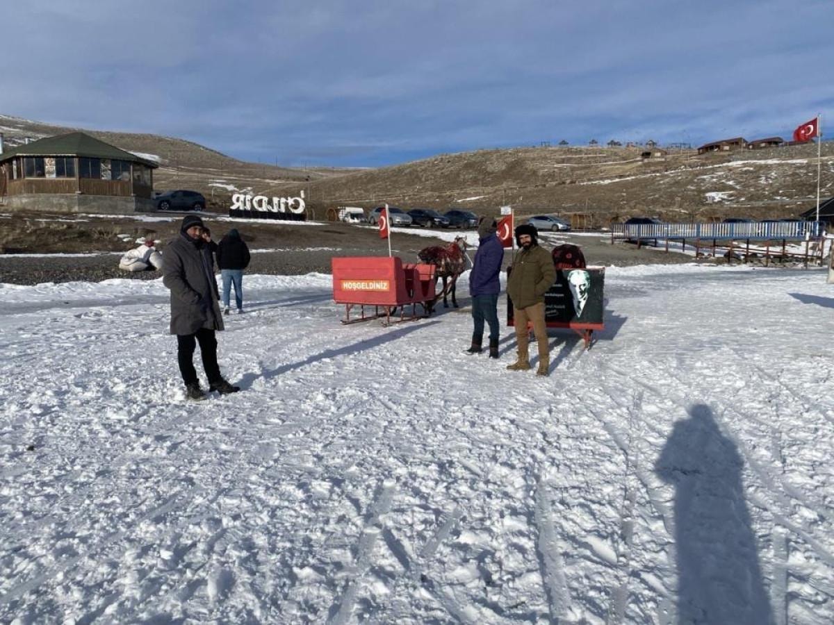 Yüzeyi yaklaşık 10 santim buz tutan Çıldır Gölü'nün simgesi haline gelen atlı kızaklar da buzun üzerine çıkmaya başladı.