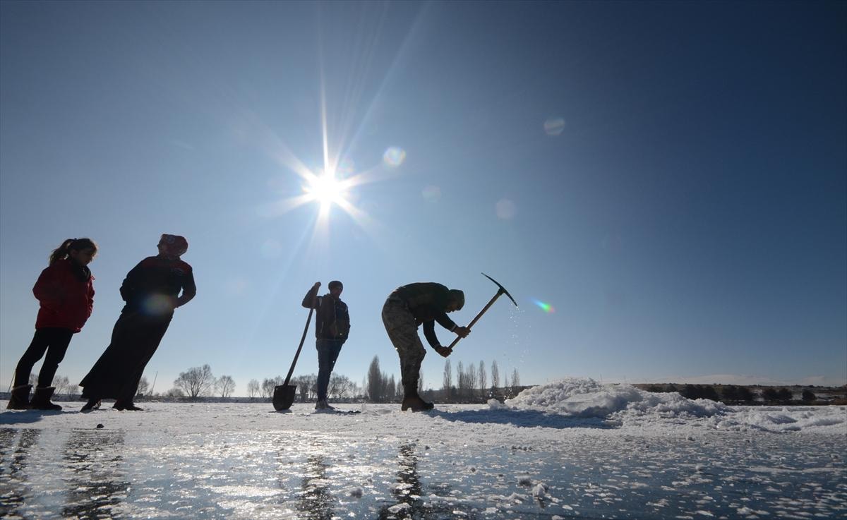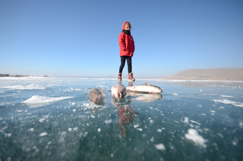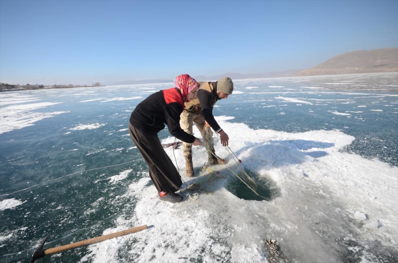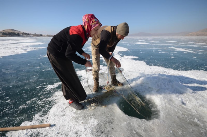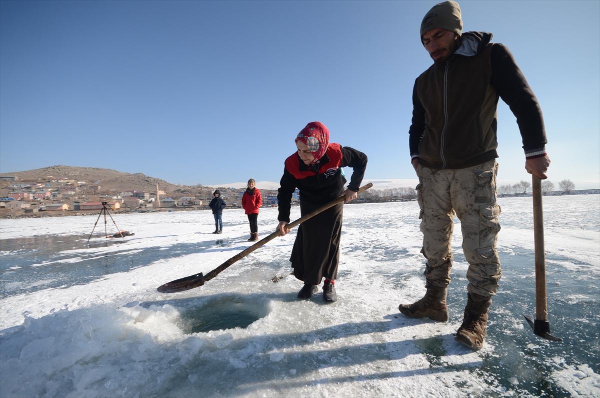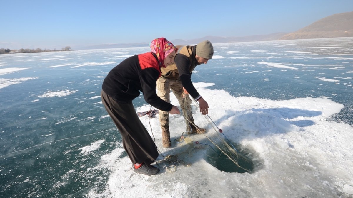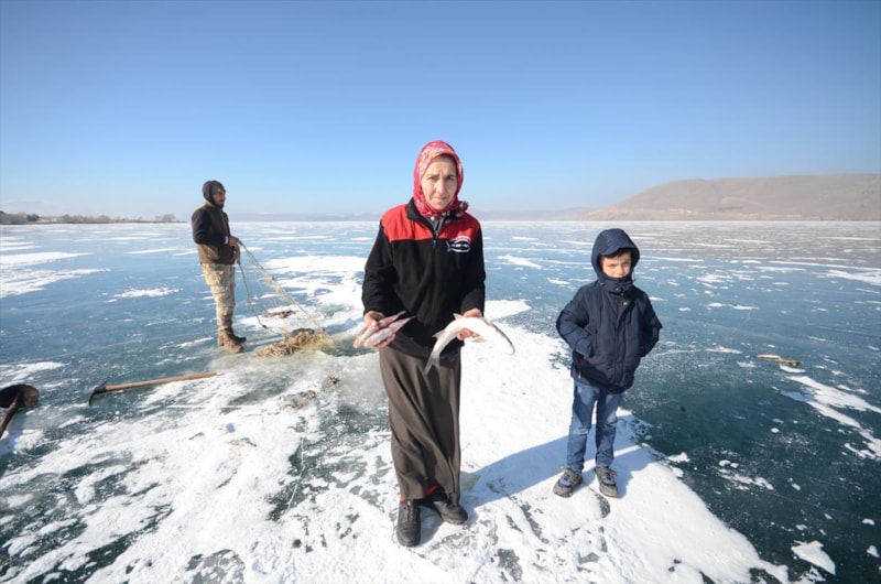 Köyün kadın balıkçısı Kılıç, dondurucu soğukta eşi Turhan, oğulları Kurtuluş ve Yiğit ile buzla kaplı gölde balık avına çıkarak ekmeğinin peşinden koşuyor.
