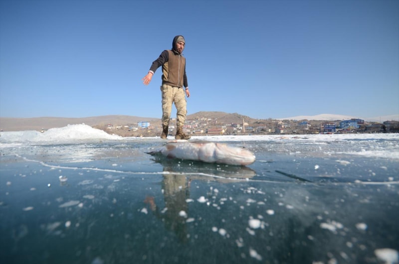 Çınar Kılıç da soğuklar nedeniyle yüzeyinin tamamı buzla kaplanan gölde Eskimo usulüyle balık avlayarak geçimini sağlıyor.
