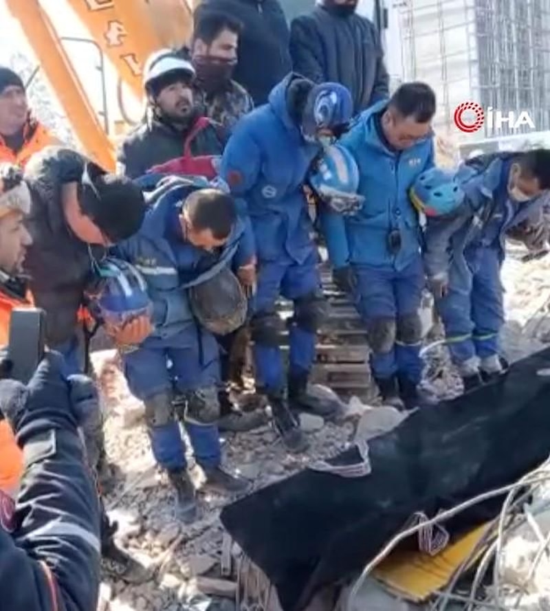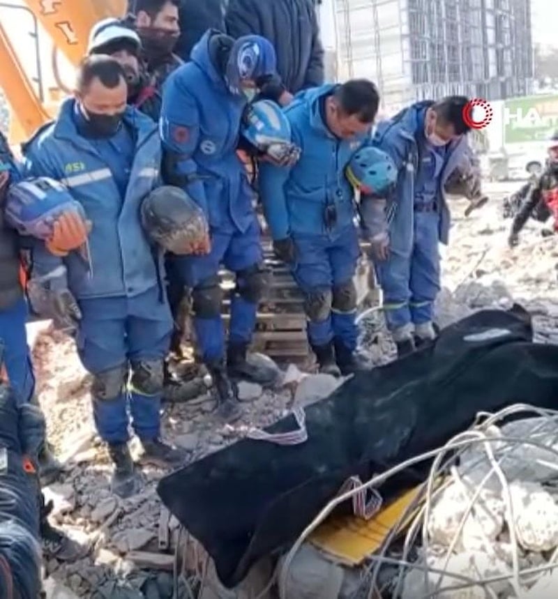 Malatya'da enkaz altından anne ve kızının cenazelerini çıkartan Çin ekibi, baretlerini ellerine alarak cansız bedenleri selamladı.