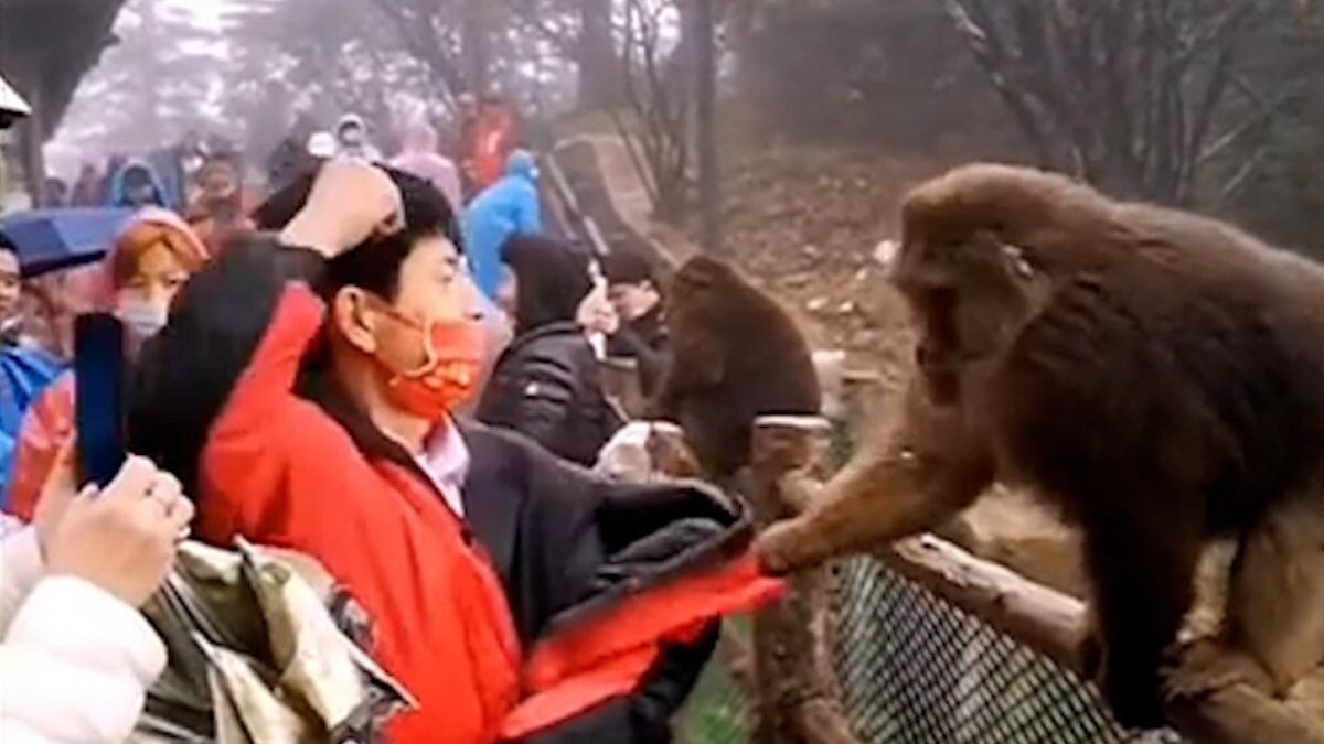 19 Ekim'de Çin'in Sichuan Eyaletindeki Emei Dağı'nda bir maymun, turistin kolunu çekip çantasını almaya çalıştı.