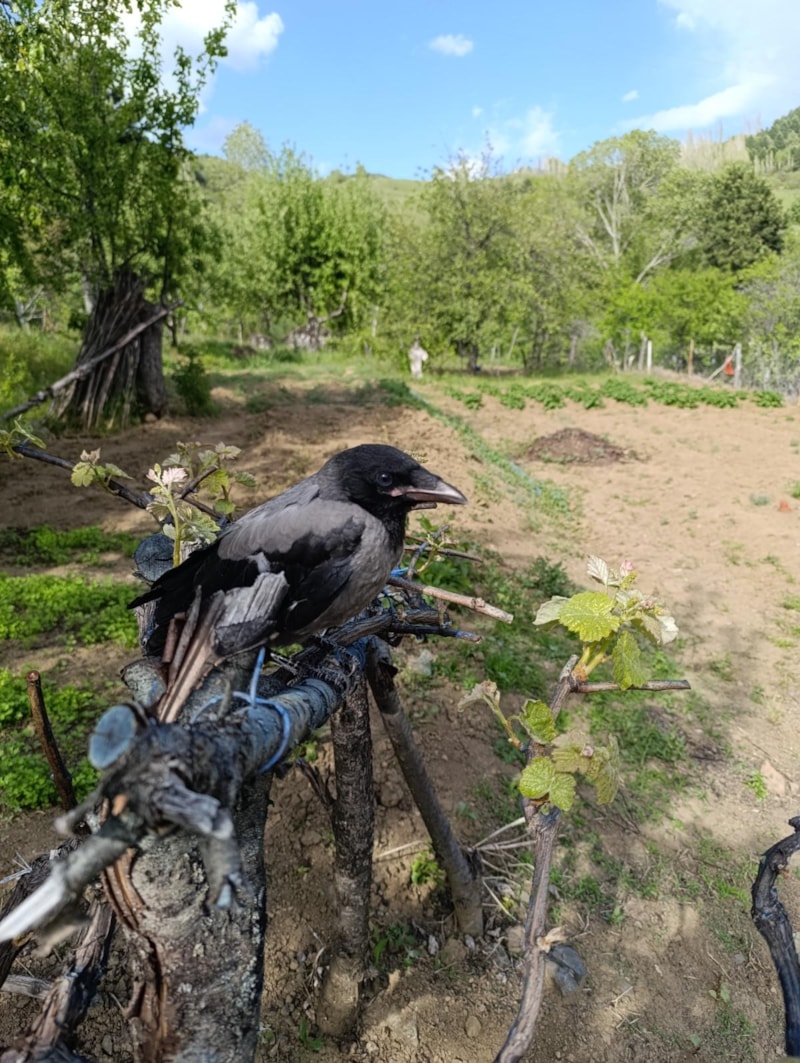 Bu yavruyu köpeklerin ağzında gördüm. Enjektörle besledim, iki-üç saatte bir mamayla ilgilendim. Sonra doğasına bıraktık, birkaç gün içinde geri geldi. Artık istediğinde geliyor, kendini sevdiriyor ve karnını doyuruyor. Geçen yıllarda da başka yavru kargaları besledik ve doğaya saldık. Her sene birkaç yavru nasip oluyor, bakıyoruz.