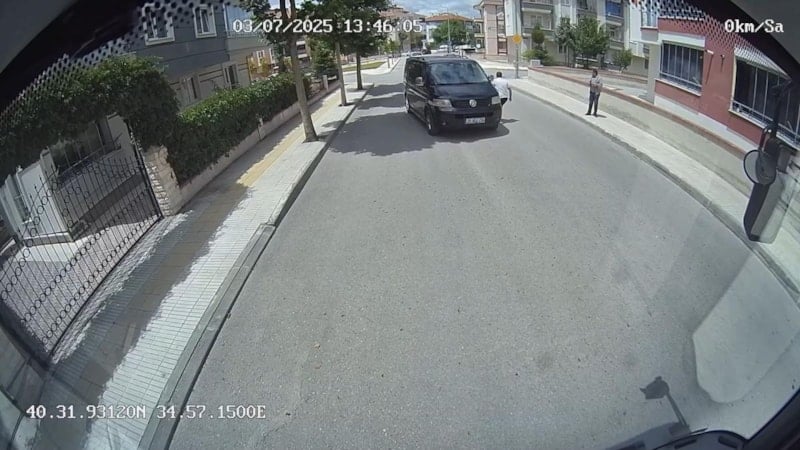 Çorum'da el freni çekilmeyen bir araç kaza yapmak üzereyken, şoförsüz minibüsü gören halk otobüsü şoförü kazayı saniyelerle yarışarak engelledi...