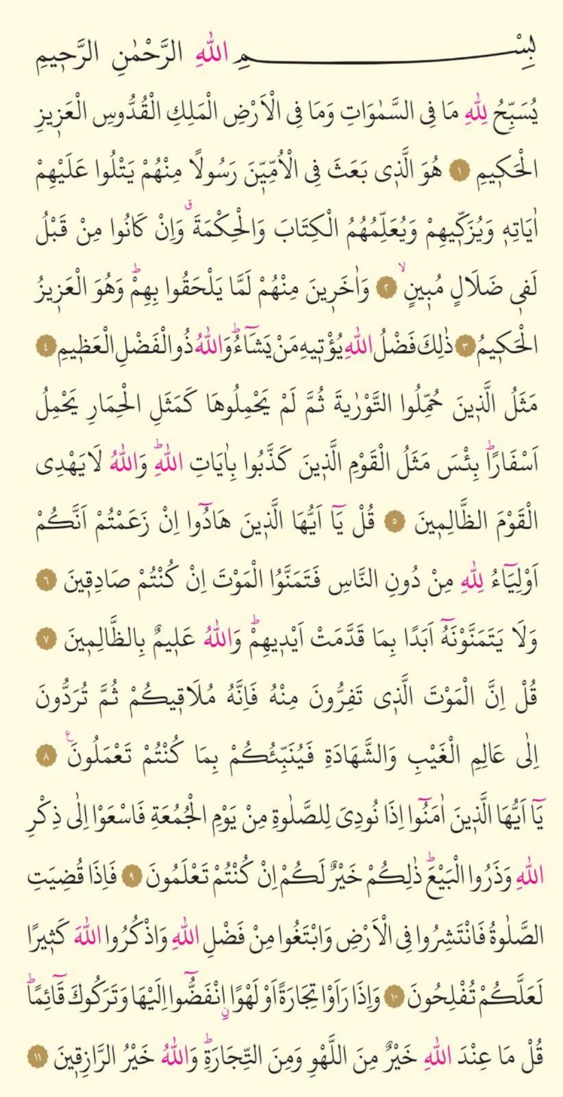 11. Ve-iżâ raev ticâraten ev lehven(i)nfaddû ileyhâ ve terakûke kâ-imâ(en)(t) kul mâ ‘inda(A)llâhi ḣayrun mine-llehvi ve mine-tticâra(ti)(t) va(A)llâhu ḣayru-rrâzikîn