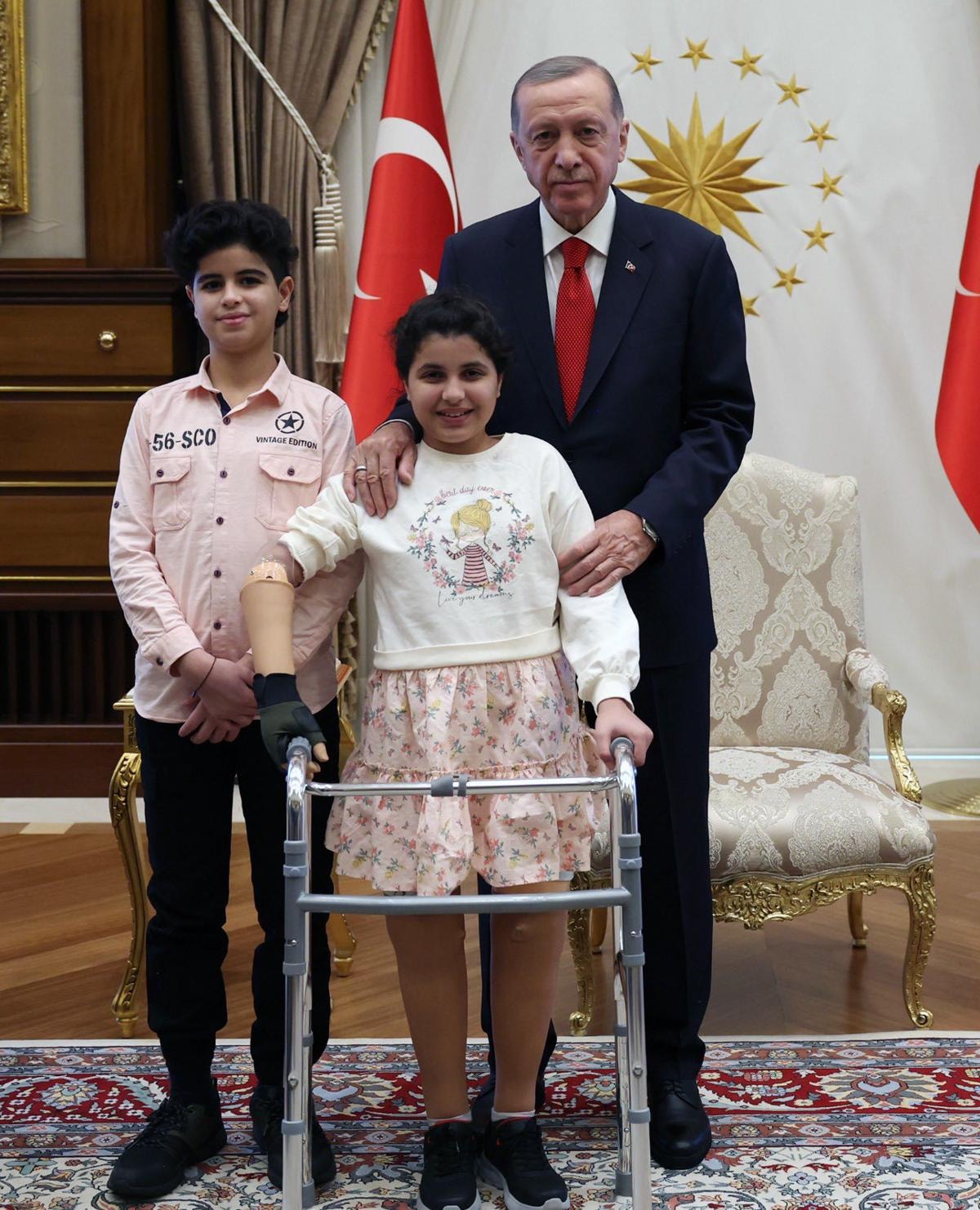 Cumhurbaşkanı Recep Tayyip Erdoğan, Gazze'de yaralanan ve Türkiye'de tedavi edilen Filistinli Rahaf ile Muhammed Halil Salman kardeşleri kabul etti.
