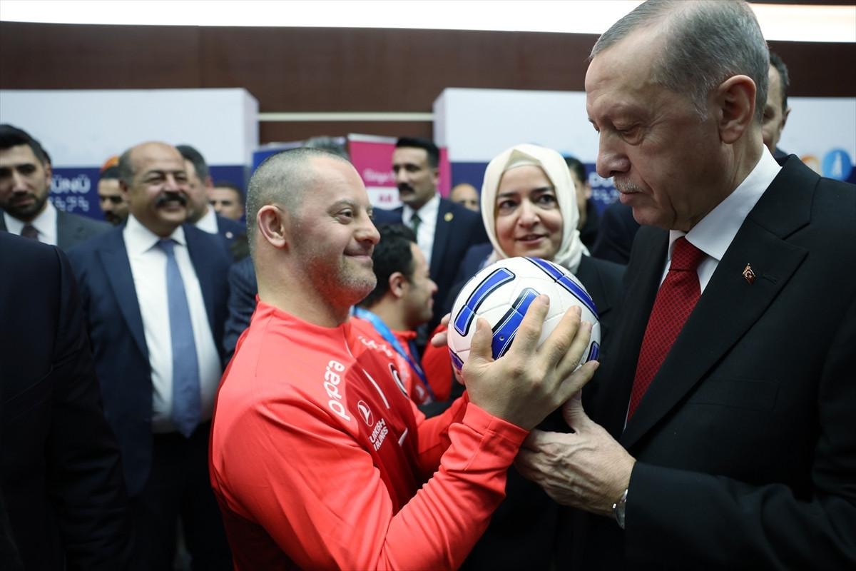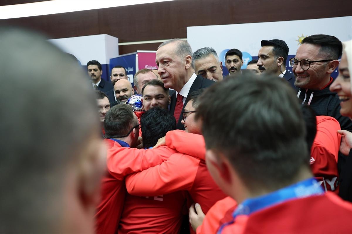 Erdoğan burada, Avrupa şampiyonu olan down sendromlu Futsal Milli Takımı oyuncuları ile bir araya geldi.
