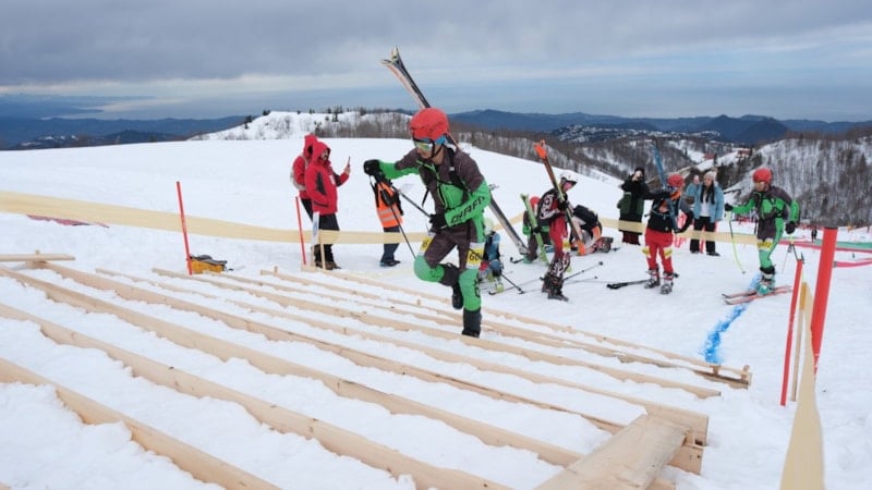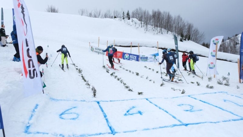 Güneysu ilçesinde bulunan Handüzü Yaylası’nda oluşturulan parkurlarda yarışan sporcular, karla kaplı yamaçları tırmanarak ardından kayakla en kısa sürede bitiş çizgisine ulaşmaya çalıştı.