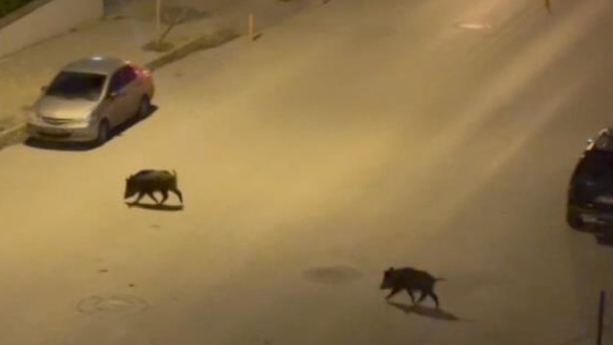 Denizli'nin Merkezefendi ilçesindeki Gerzele Mahallesi'ndeki ormanlık alandan evlerin bulunduğu bölgeye inen yaklaşık 20 yaban domuzu, çevrede yiyecek ararken görüntülendi.