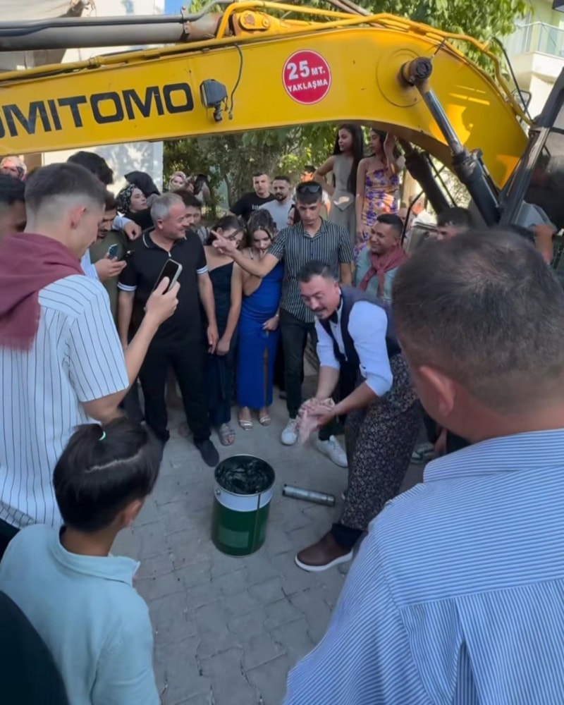 Güney ilçesinde düzenlenen düğün töreni renkli anlara sahne oldu. Gelin alma töreninin ardından damadın arkadaşları, damada iş makinasını yağlatarak eğlendiler.