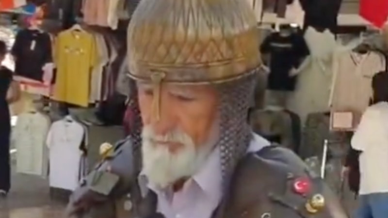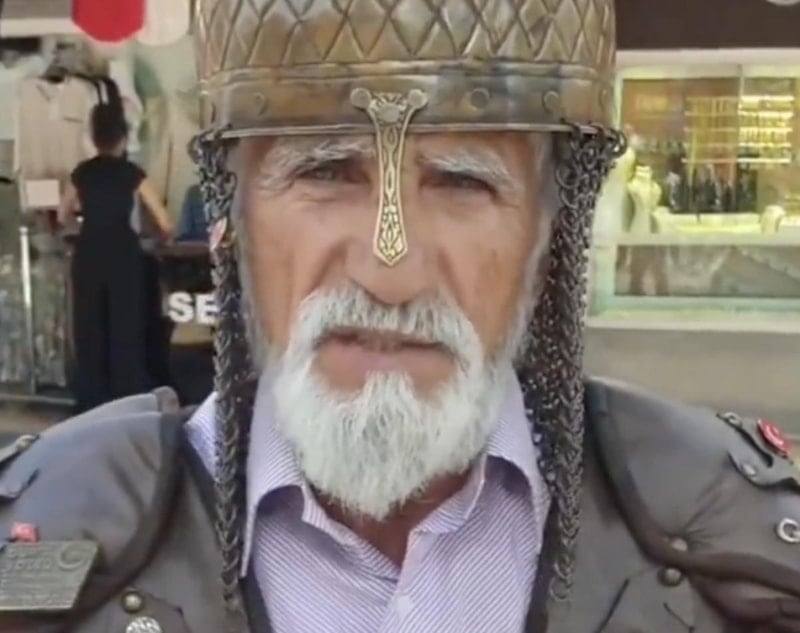 Sultan Alparslan'ın torunu olduğunu iddia eden adamın cuma namazına miğfer ve asker kıyafetiyle gelmesi dikkat çekerken, o anlar bir vatandaşın cep telefonu kamerasına yansıdı.