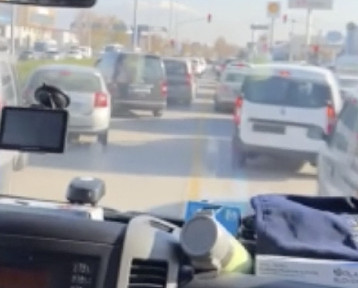 Denizli'nin Menderes Bulvarı'nda seyreden ambulans, Sadıkoğlu Kavşağı yakınlarında trafiğin sıkışması nedeniyle sirenlerini açtı.