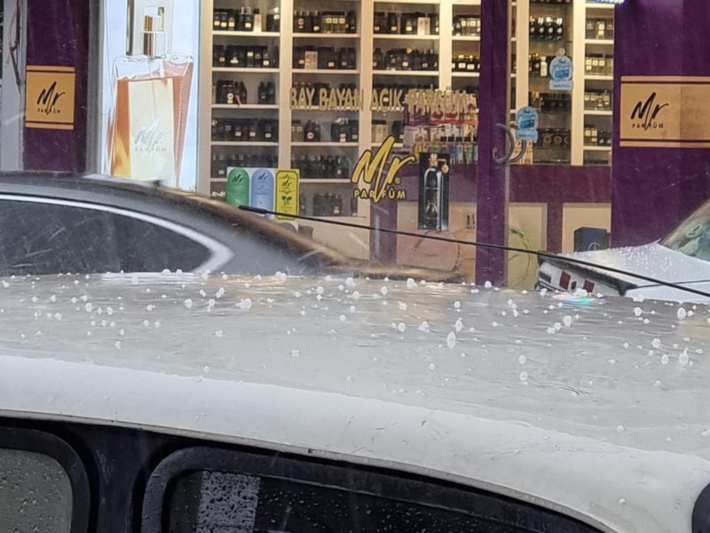 Afetten etkilenen kentte yarım saat içinde şiddetini artıran yağmur ve dolu sürücülere ve vatandaşlara zor anlar yaşattı.