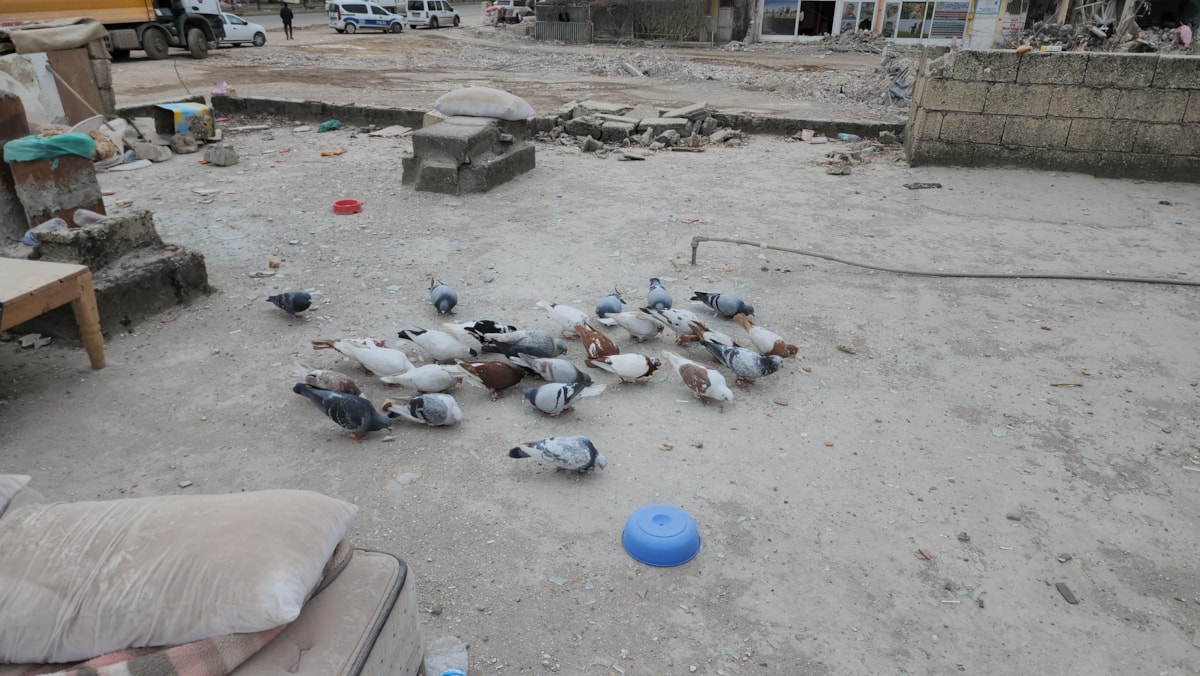 Adıyaman’da taklacı güvercinlerin barındıkları bina yıkıldı. Sahiplerinin de şehri terk ettiği güvercinleri, komşuları elleriyle beslemeye başladı.