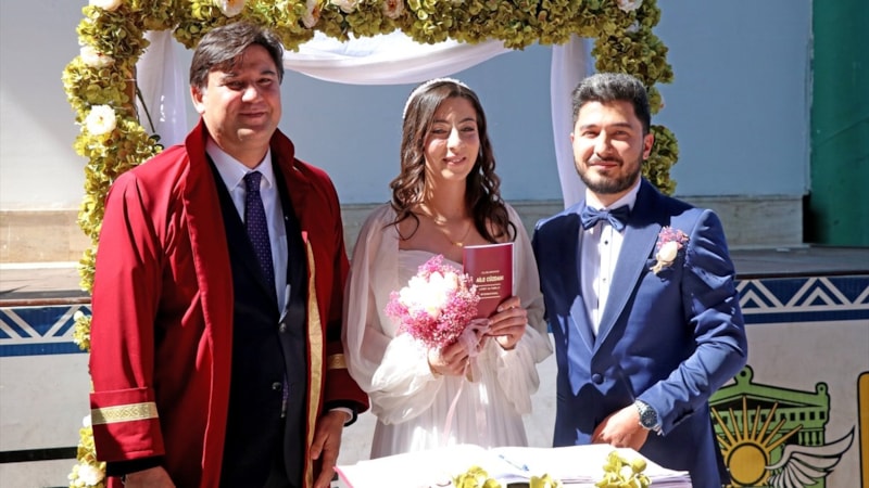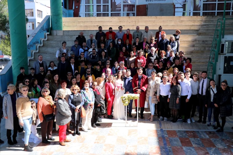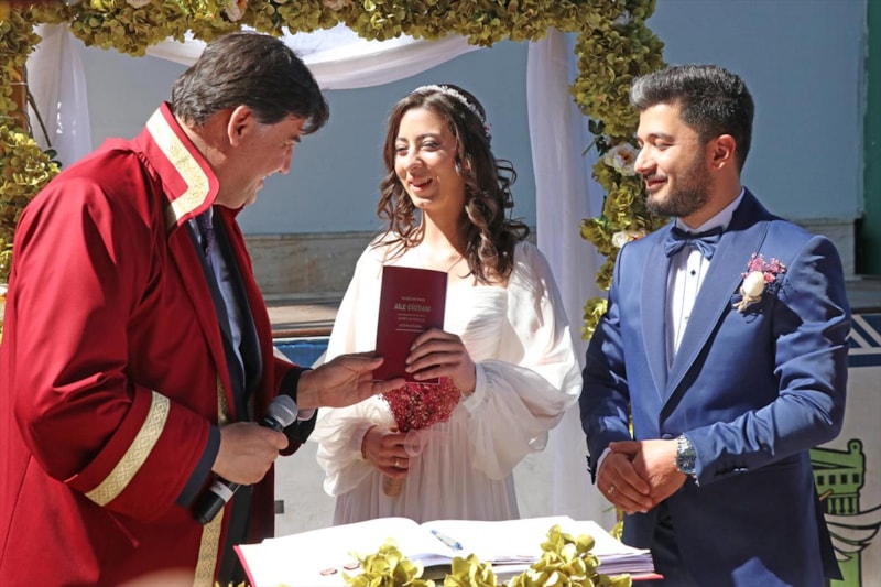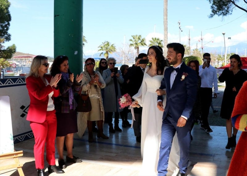 Fethiye Belediyesi'nin desteğiyle genç çift, Özer Olgun Kültür Merkezi önünde düzenlenen törende, Belediye Başkanı Alim Karaca'nın kıydığı nikahla dünyaevine girdi.