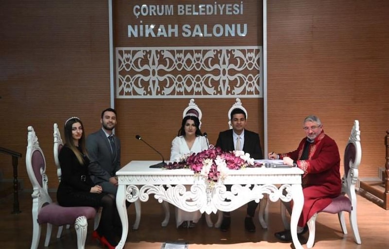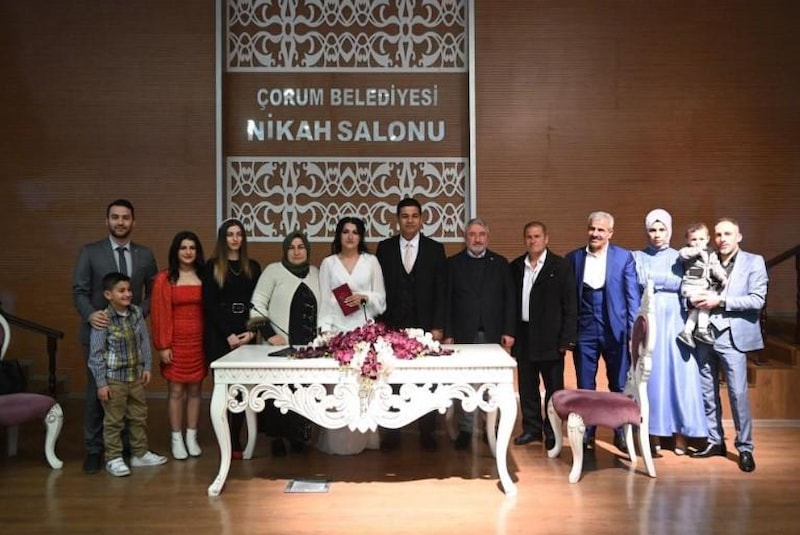 Evlilik kararı alan genç çift, Çorum Belediyesi’ne nikah başvurusunda bulundu. İşlemlerin tamamlanmasının çiftin nikahı Belediye Başkanı Halil İbrahim Aşgın tarafından kıyıldı.