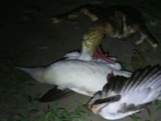Yengecin bu seferki kurbanı ise ağaçta yuva yapan kızıl ayaklı sümsük kuşu oldu. Kuş önce yengeci ayaklarıyla itmeye çalıştı, ancak başarısız oldu. Kuşa göre daha kuvvetli olan yengeç, kuşu avladı. Yengeç, önce kuşun bacaklarını ardından da kanatlarına zarar verdi.