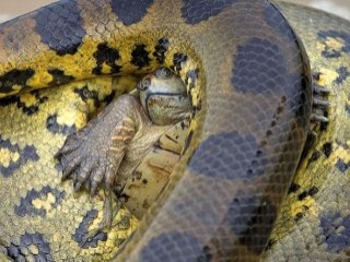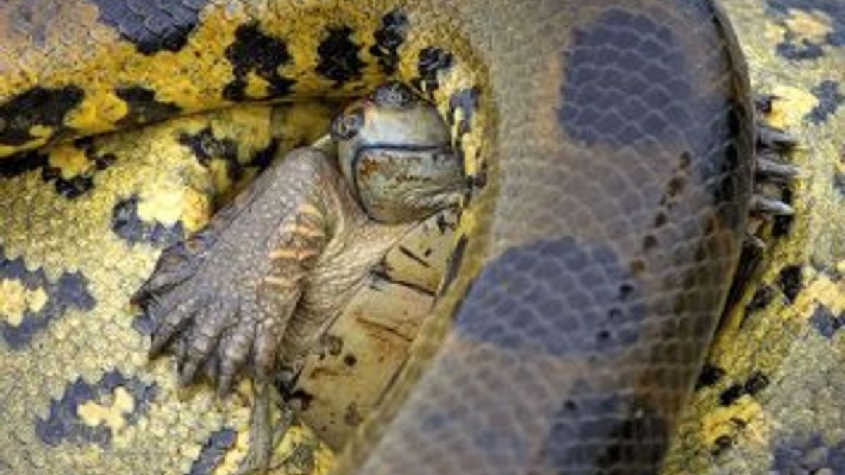 Minik kaplumbağa dev anakondaya sonuna kadar direndi ve sert kabuğu sayesinde ölümden kurtuldu.