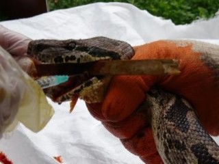 Bursa Büyükşehir Belediyesi bünyesinde bulunan, Bursa Hayvanat Bahçesi'nin konukları arasında yer alan 3 metre boyunda ve 25 kilo ağırlığındaki dev boa yılının ağzında oluşan enfeksiyona, Veteriner Hekim Hatice Karakuzulu görevliler ile ağzına tahta sıkıştırılarak müdahale edildi. Yılanın yarasının geçmek üzere olduğunu söyleyen Veteriner Hekim Hatice Karakuzulu, "Bu hayvanlarda benzer hastalıklar zaman zaman görülüyor. Rahatsızlığı beslenme dönemlerindeki halsizliklerinden anlıyoruz. Müdahalesini yaptıktan sonra sorun gideriliyor. Hayvanat bahçesindeki bu yılanda bir hafta içersinde sağlığına kavuşur." dedi.
