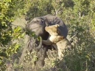 Yavrularına yemek götürmek isteyen bir dişi aslan, yavru file saldırdı. Tek eliyle fili devirmeye çalışan dişi aslan, bir süre böyle mücadele etti. İki güçlü hayvan arasındaki bu kapışmadan, yavru fil galip çıktı.