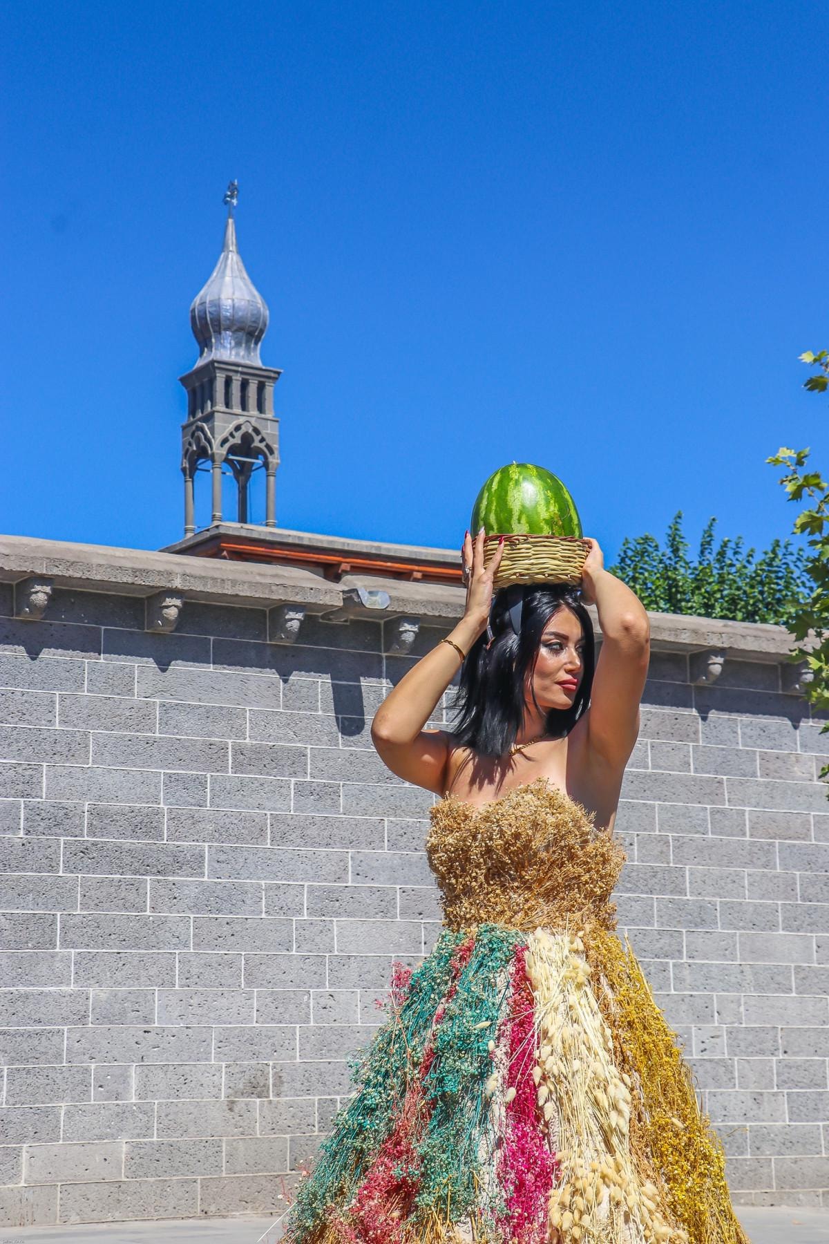 Özellikle Şanlıurfa biberi ve buğday başağı gelinlikle başında Diyarbakır karpuzu taşıyan mankenin giydiği tasarımlar dikkat çekerken defileyi izleyenler, fotoğraf çekti.