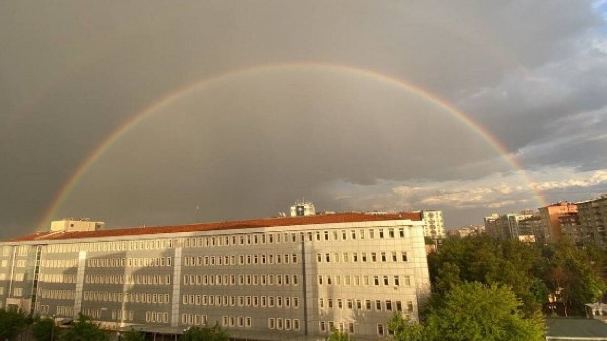 DHA'nın haberine göre kent merkezinde, bir çok noktadan görülen gökkuşağı, seyirlik görüntüye neden oldu. Vatandaşlar kısa süren renk cümbüşünün keyfini çıkardı.
