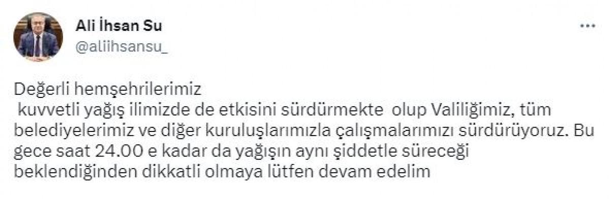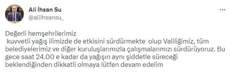 Vali Su, paylaşımında, "Değerli hemşehrilerimiz kuvvetli yağış ilimizde de etkisini sürdürmekte olup Valiliğimiz, tüm belediyelerimiz ve diğer kuruluşlarımızla çalışmalarımızı sürdürüyoruz. Bu gece saat 24.00'e kadar da yağışın aynı şiddetle süreceği beklendiğinden dikkatli olmaya lütfen devam edelim” ifadelerini kullandı.