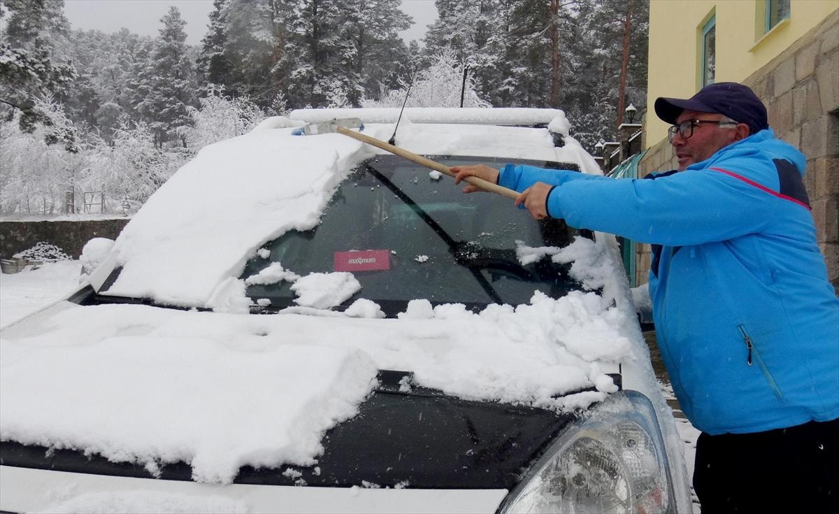 Bitkiler ve ağaçların karla kaplandığı ilçede vatandaşlar da araçlarının üzerinde biriken karları temizledi.