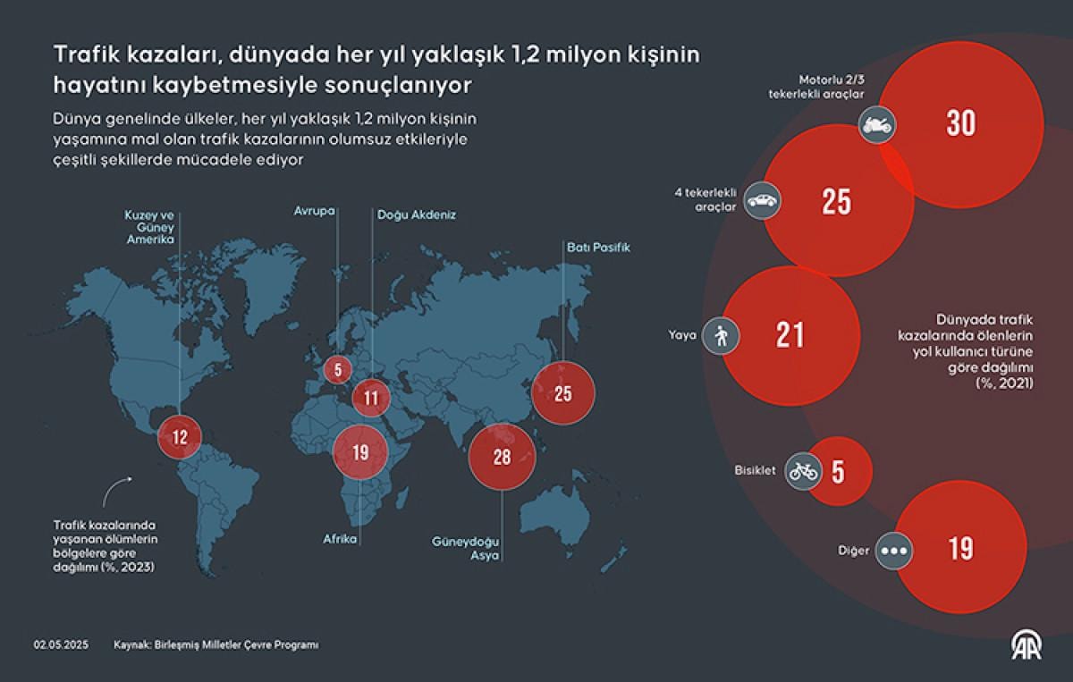 Bu soruna dikkat çekmek ve farkındalık oluşturmak amacıyla her yıl mayıs ayında "Karayolu Güvenliği ve Trafik Haftası" düzenleniyor. AA muhabiri, bu hafta dolayısıyla dünyanın dört bir yanından trafik kazalarına ilişkin verileri derledi.