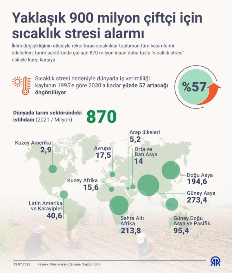 İklim değişikliği nedeniyle rekor kıran sıcaklıklar dünya genelinde herkesi etkilerken, tarım sektöründe çalışan 870 milyon insan için daha fazla "sıcaklık stresi" nedeniyle uyarı yapıldı.