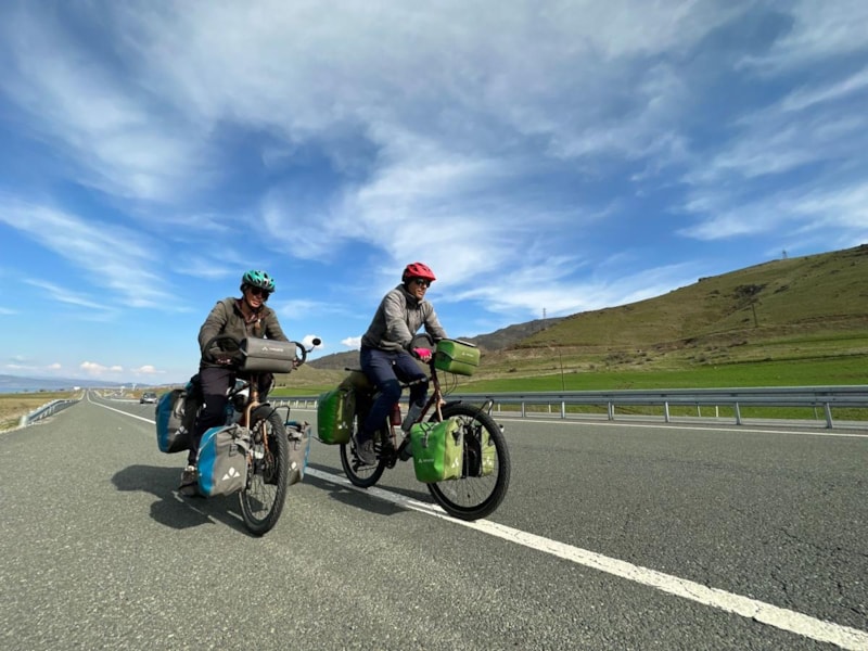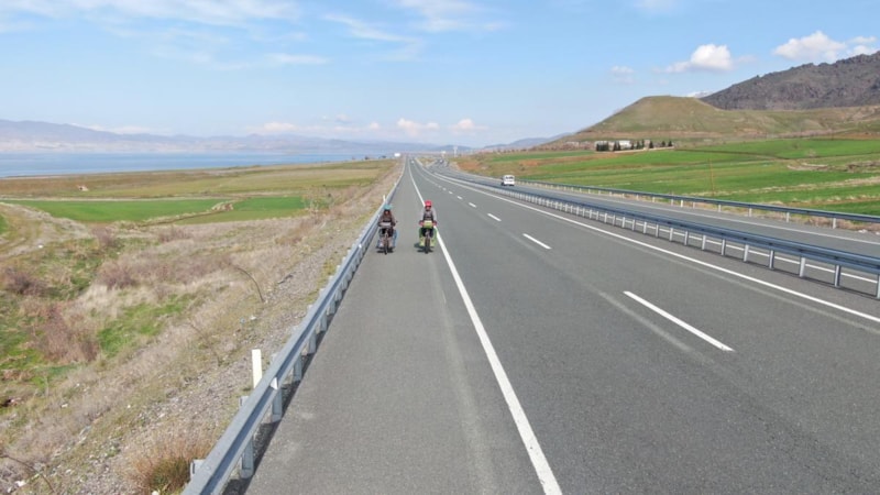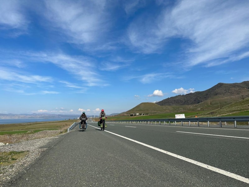 Biz Fransa’dan geldik. Van’dan Fransa’ya doğru bisiklet sürüyoruz. Kapadokya içerisinden geçeceğiz sonra İstanbul’a gideceğiz. Buraya gelmeden önce Güney Amerika’da 10 bin kilometre yaptık. Peru’dan Patagonya’ya gittik. Yaklaşık günde 80 km bisiklet sürüyoruz. Hemen hemen her gece çadırda kamp yapıyoruz. Türkiye ve insanları muhteşem. Bizim amacımız yavaş yavaş seyahat etmek manzaranın tadını çıkarmak. Türkiye muhteşem, manzaraları çok güzel. İnsanlar çok iyi. Hayatımda İlk defa bu kadar iyi niyetli insanlarla karşılaştım. Yemekleri çok harika. İnsanları çoğu zaman bizi yemeğe, çaya ve uyumaya davet ediyor. İstanbul’a varmak için 60 gün planlıyoruz. Zor değil adım adım gidiyoruz sıkıntı yok.