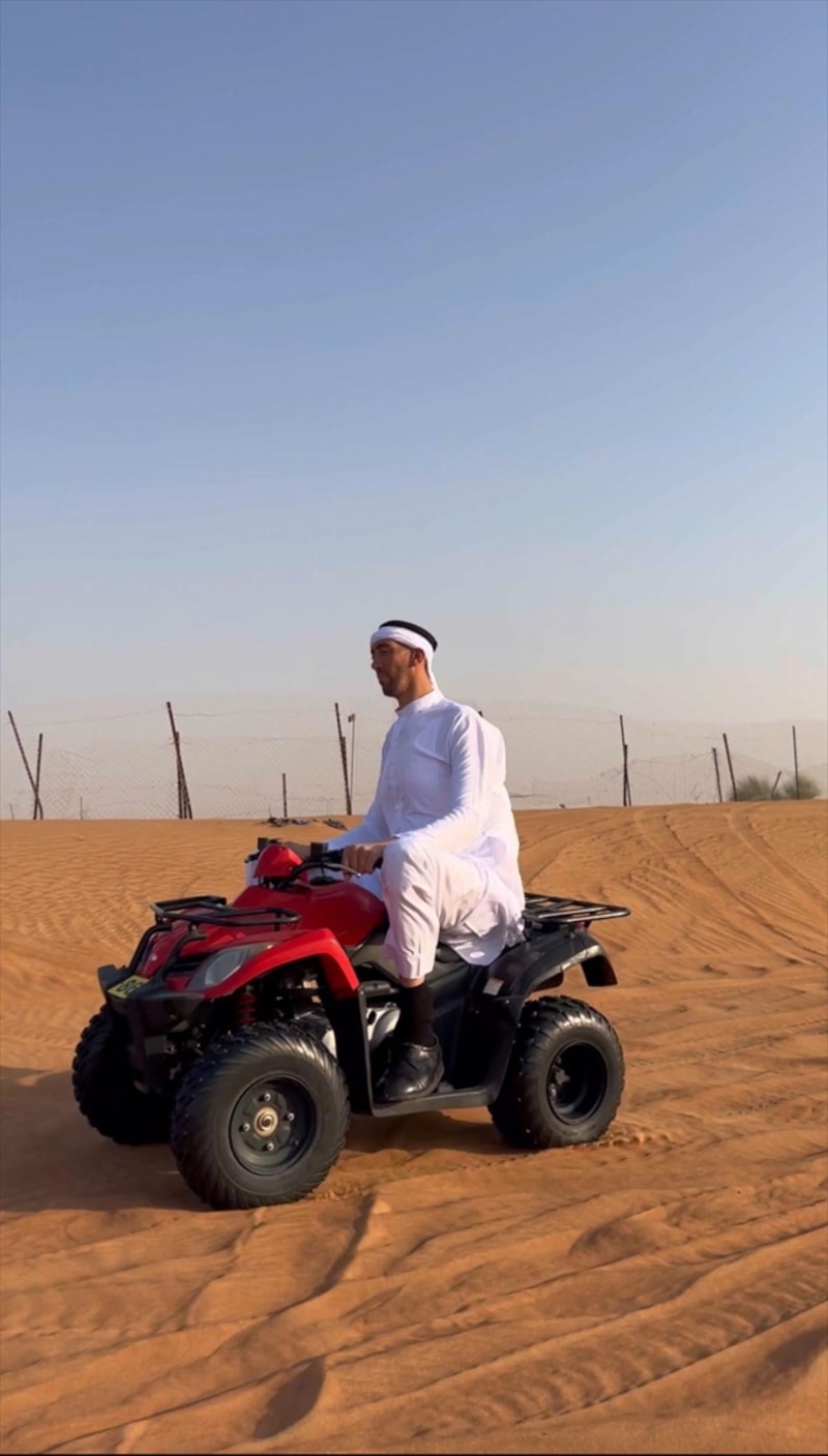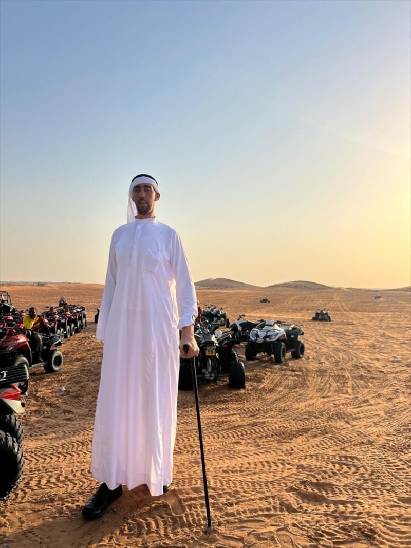 Guinness Rekorlar Kitabı'ndaki ünvanını 2 metre 51 santimetre boyuyla 15 yıldır koruyan Mardinli Sultan Kösen, Dubai'de geleneksel beyaz giysi giyerek ATV ile çöl safarisi yaptı..