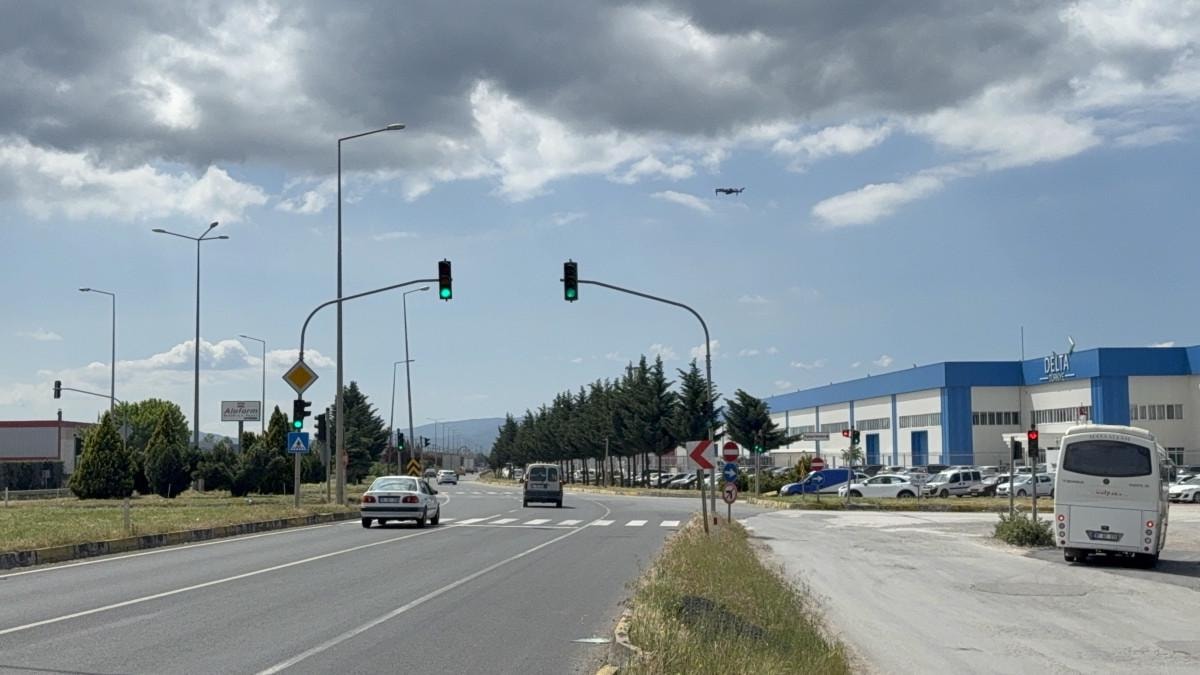 Kırmızı ışık ihlalleri gerçekleştiren sürücüler, drone'la tek tek tespit edilerek denetime alındı.