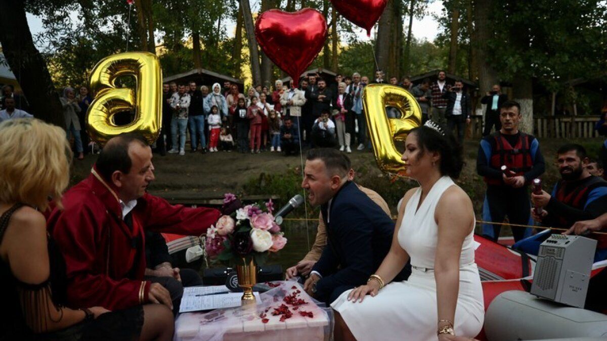 AA'nın haberine göre; Cumayeri Belediyesinden nikah günlerini alan çift, gelin aracı gibi süsledikleri rafting botuna nikah masası kurdu, "gelin bota binmiş ya nasip demiş" yazısı astı.