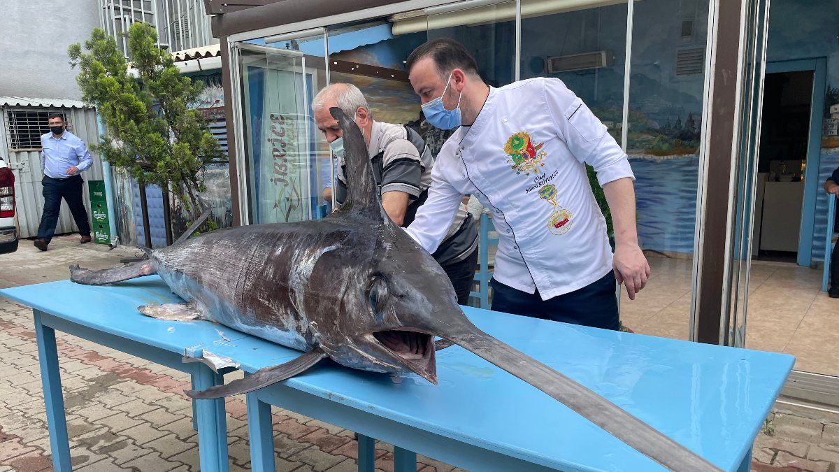 Restoran işletmecisi, kılıç balığını bahçeye koyarak sergiledi. Dev kılıç balığını görenler şaşkınlık yaşadı. Bazı vatandaşlar, balıkla fotoğraf çekildi.