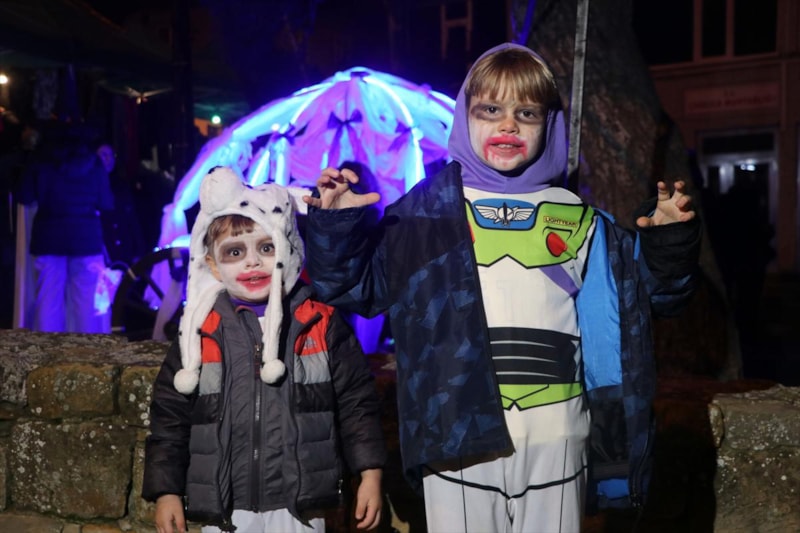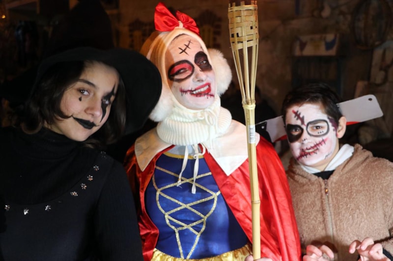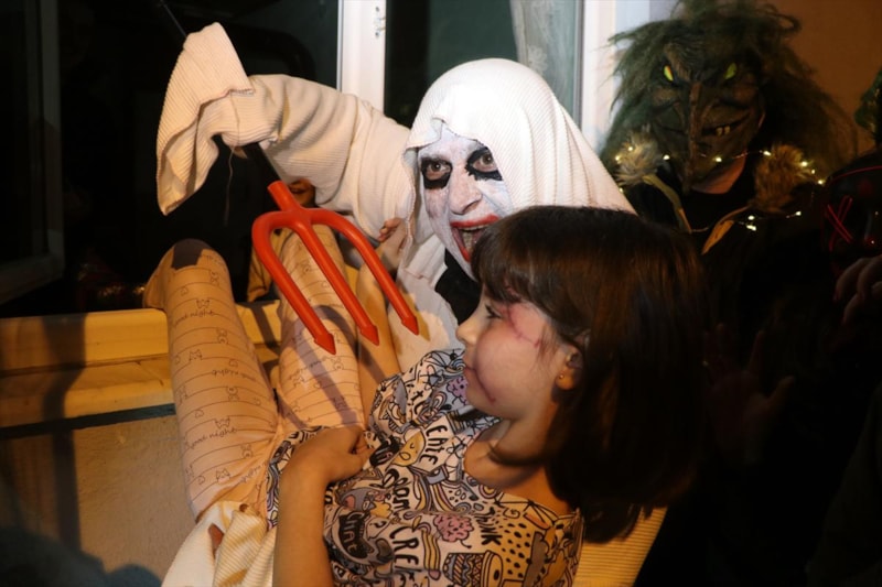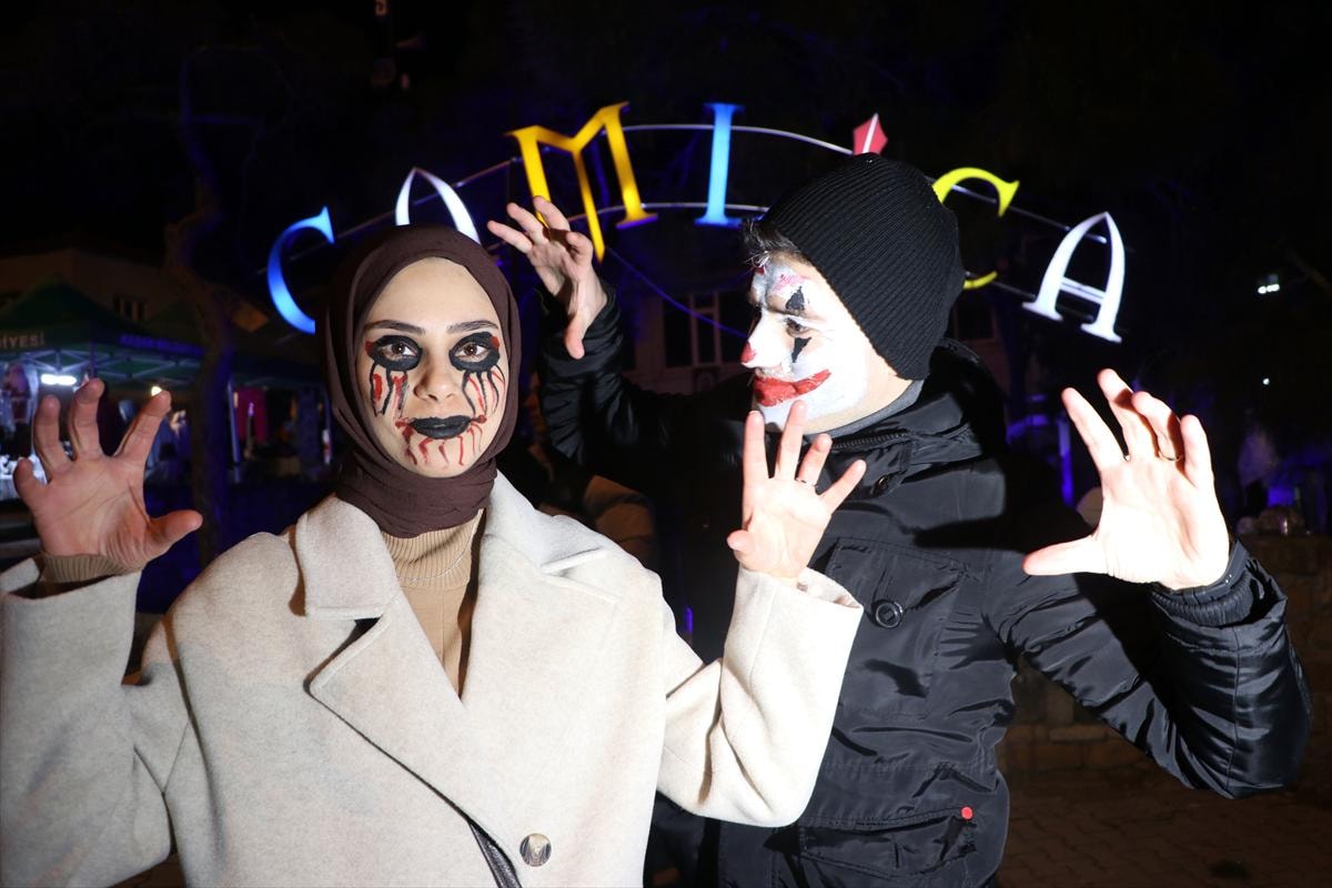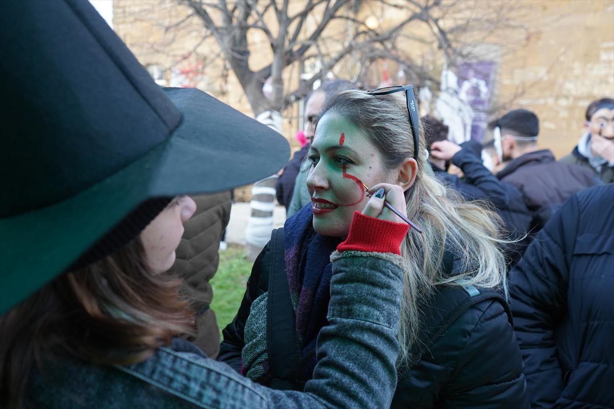 Köy meydanında etkinlik için düzenlenen alanda katılımcılar yüzlerine korku ve dehşet uyandıracak makyaj yaptırdı.