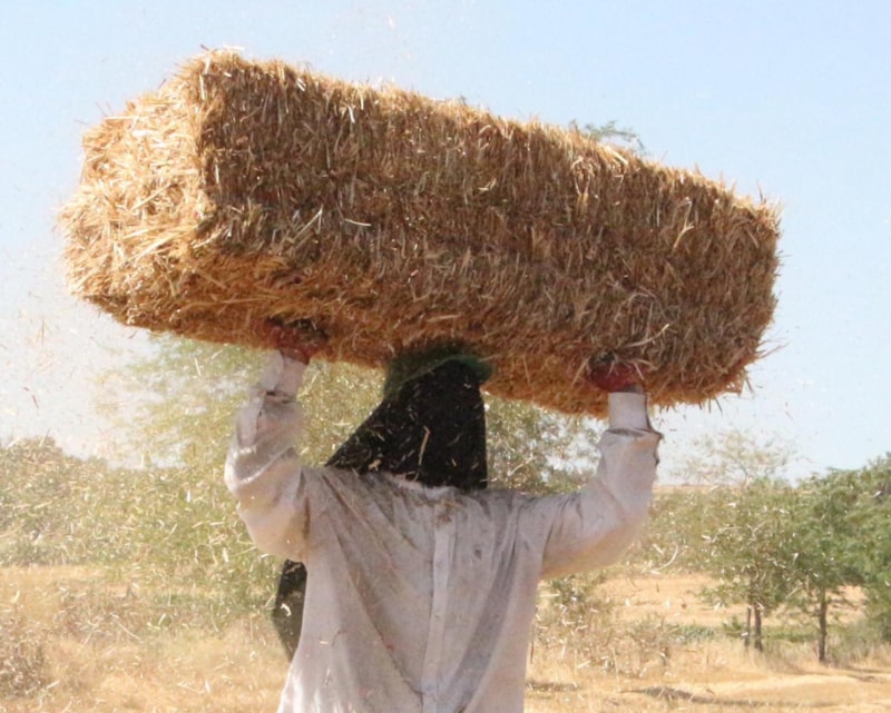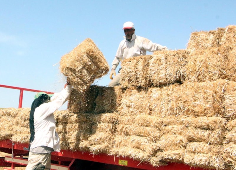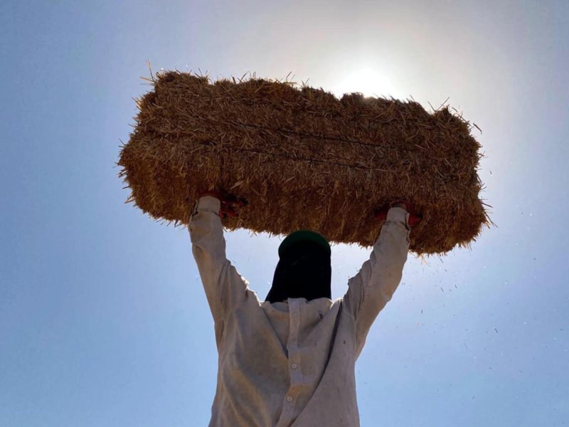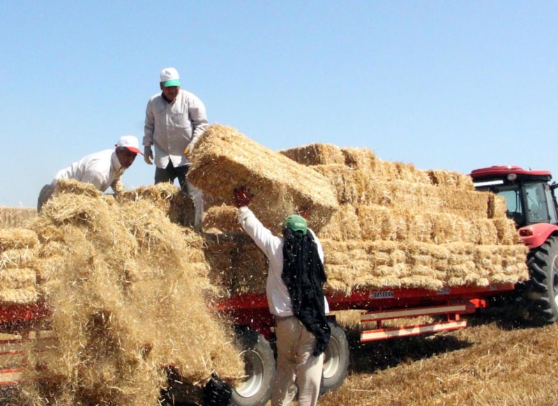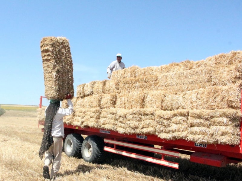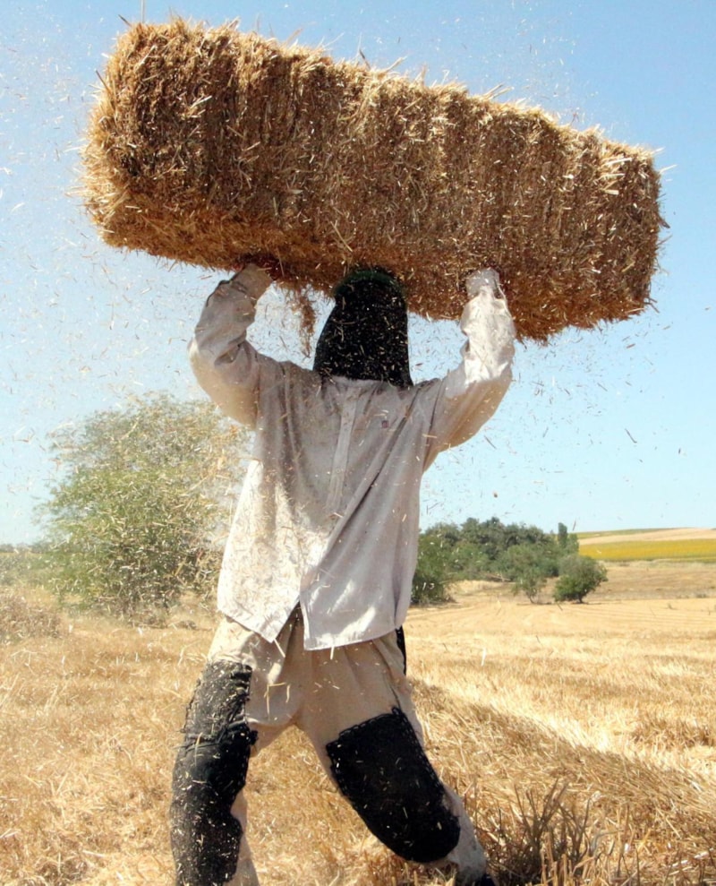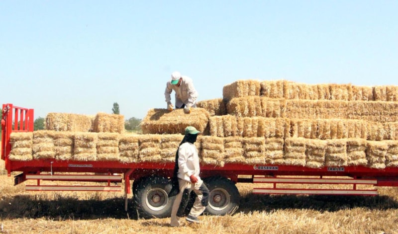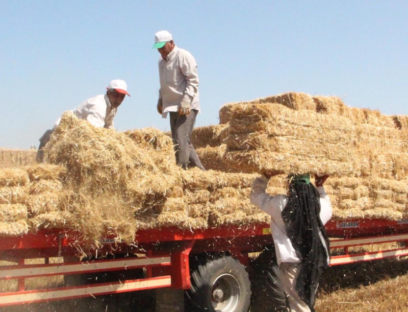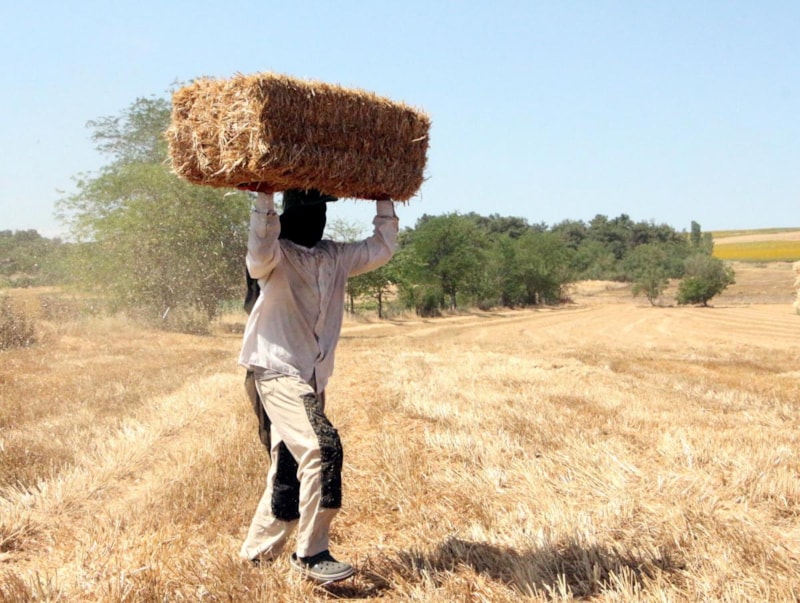 Buğday saplarının 25 kiloluk balyalara dönüştürüldüğü tarlalarda işçiler, 35 ile 40 derece arasında değişen kavurucu sıcakla da mücadele ediyor.