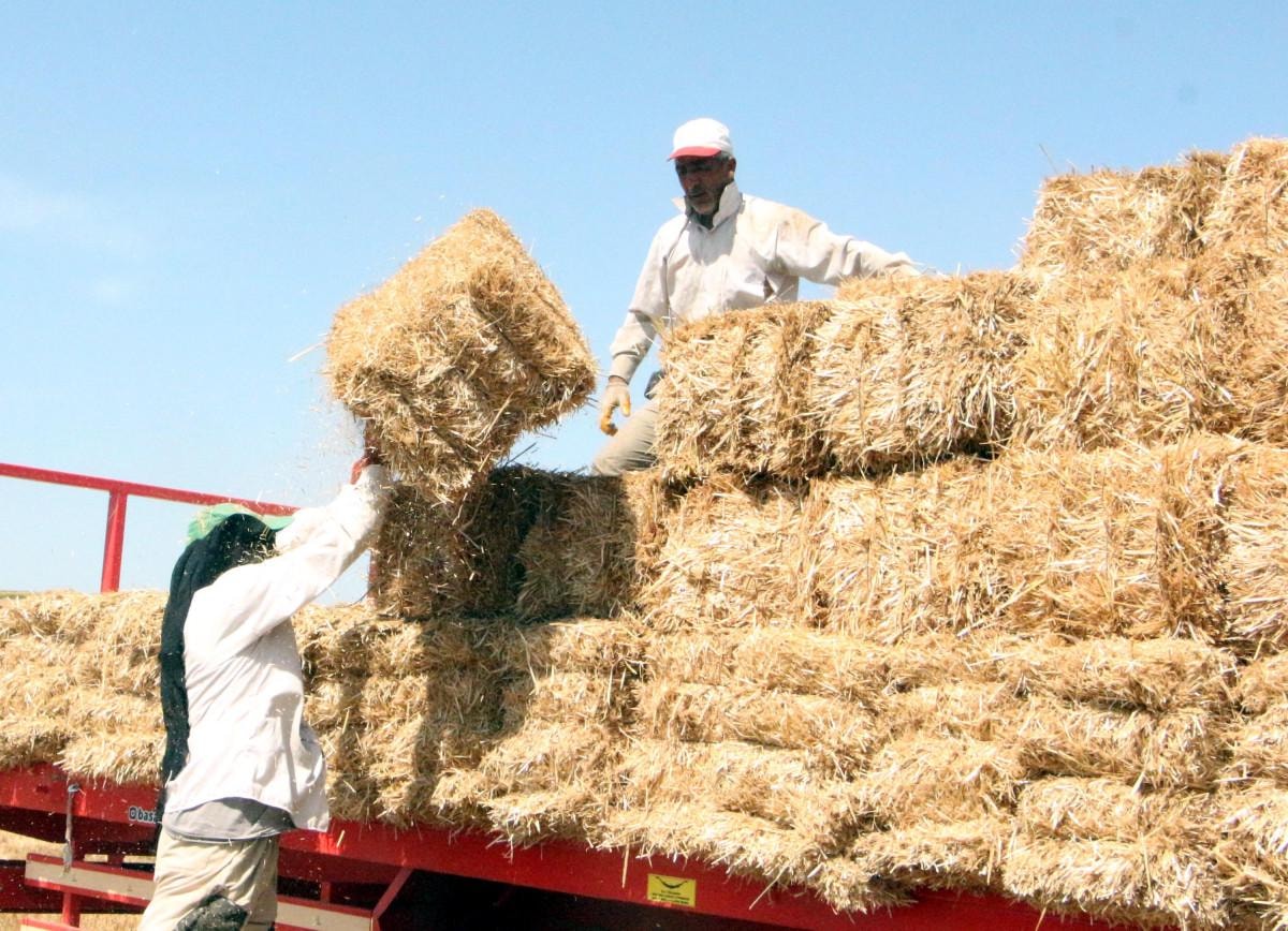 Balyalar, mevsimlik olarak bölgeye gelen işçiler tarafından traktörün çekicisine yükleniyor.