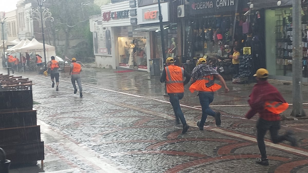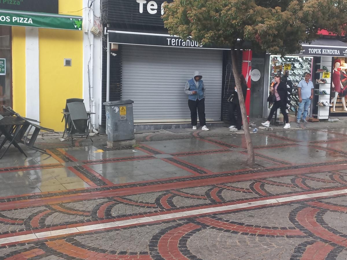 Vatandaşlar saçak ve tente altlarında beklerken esnafın da yağan yağış ile iş yerlerinin kepenk ve yerlerini temizlediği görüldü.