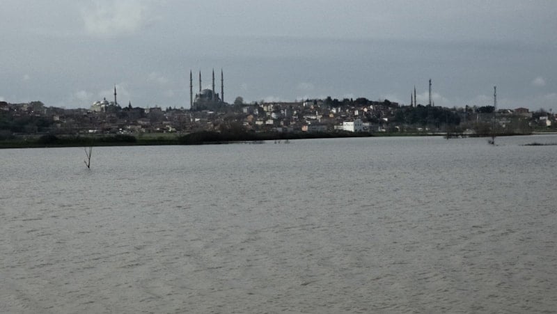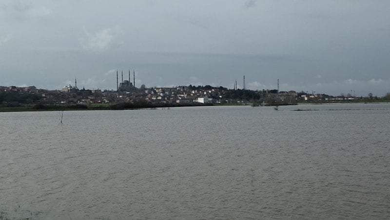 Geçmiş yıllarda da benzer görüntülerin oluştuğu Selimiye Camii çevresinde bu yıl yaşanan su taşkınları sonrası su basan tarlalardan bakıldığında caminin silueti, Sultanahmet Camii’ni andıran görüntüler oluşturdu.