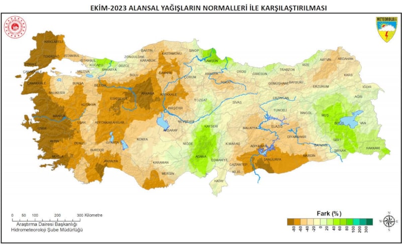 Ekim Ayı Alansal Yağış Raporu'na göre ise Türkiye geneli ekim ayı yağışları normalinin altında, geçen yıl ekim ayı yağışlarının üzerinde gerçekleşti. 2023 yılı Ekim ayı yağışı metrekareye 36,6 kilogram düştü. 1991- 2020 Ekim ayı normali 49,4 kg, 2022 yılı ekim ayı yağışı 30,8 kg olarak açıklandı. Yağışlar normaline göre yüzde 26 azalma, geçen yıl ekim ayı yağışlarına göre yüzde 19 arttı.