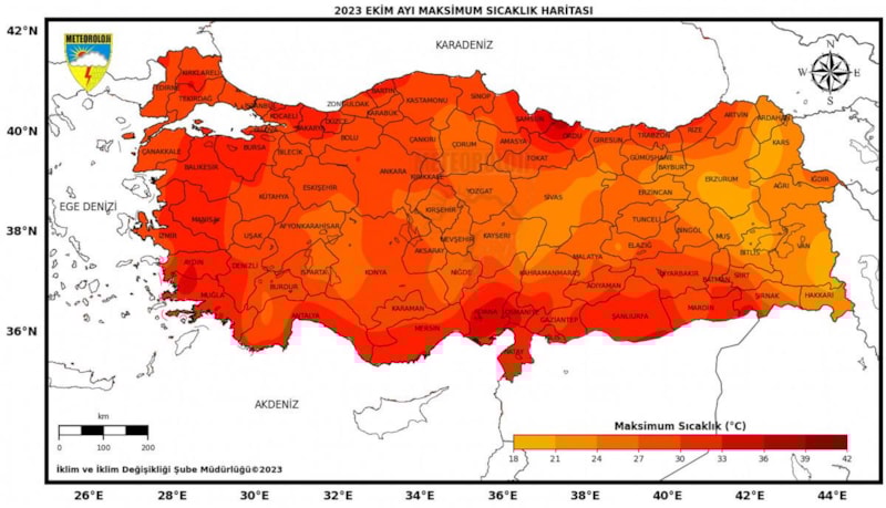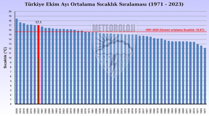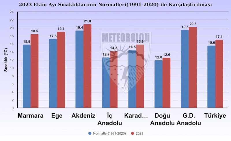 1991-2020 normalleri ekim ayı ortalama sıcaklığı 15,6 derece iken, 2023 yılı ekim ayı sıcaklığı ise 17,1 derece ile normallerinin 1,5 derece üzerinde gerçekleşti.