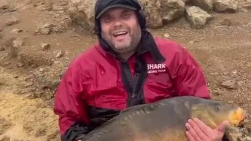 Elazığ’da bir vatandaş, baraj gölünde tuttuğu 30 ve 13 kiloluk balıkları ayağına bırakıp bebeği sallar gibi sallayarak ninni söyledi.