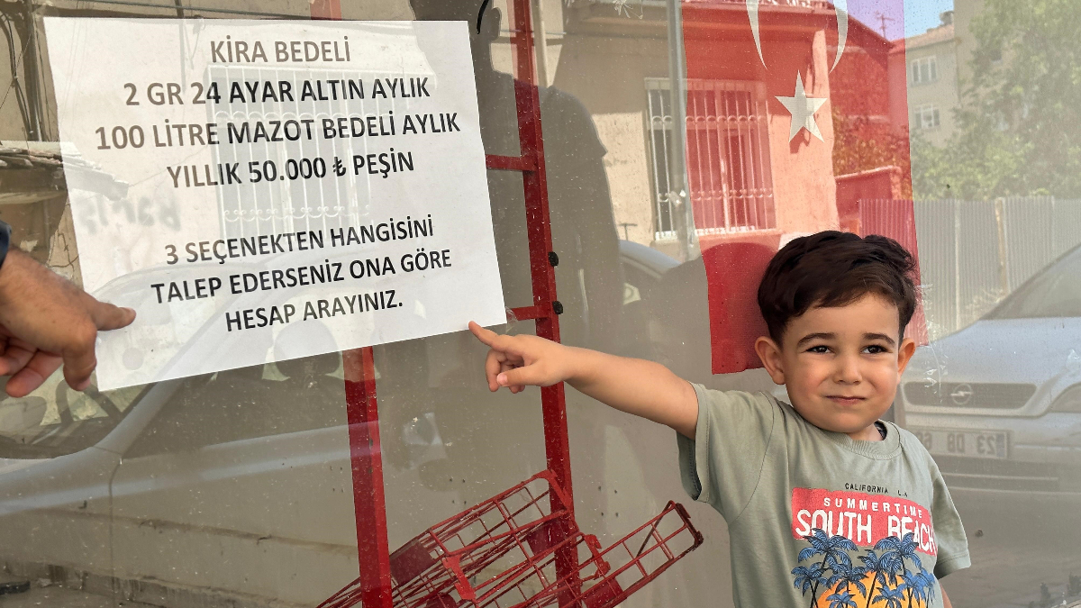 Taş'ın cama yapıştırdığı afişte yazan, ‘Kira bedeli aylık 2 gram 24 ayar altın, 100 litre mazot veya yıllık 50 bin lira peşin' seçeneklerini gören vatandaşlar şaşkınlıklarını gizleyemedi.