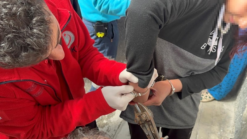 Sokakta oyun oynarken bileklerine kelepçe takan çocuğa önce itfaiye sonra polis ekipleri müdahale etti.