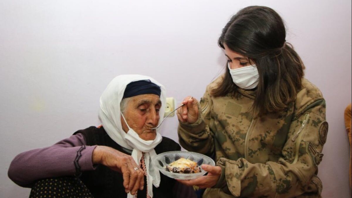 Vali Erkaya Yırık ve İlçe Kaymakamı Yunus Emre Vural da valilik koordinesindeki Vefa Sosyal Destek Grubu'nda yer alan kadın jandarmalarla Şahide Nine'yi evinde ziyaret etti.